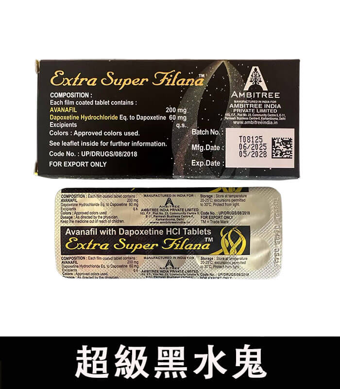印度黑水鬼(Extra Super Filana) 結合兩大關鍵成分:阿伐那非(Avanafil) 與 達泊西汀(Dapoxetine),同步解決「硬度不足」與「過快射精」兩大問題,是目前市面上極具代表性的雙效型男性壯陽藥。