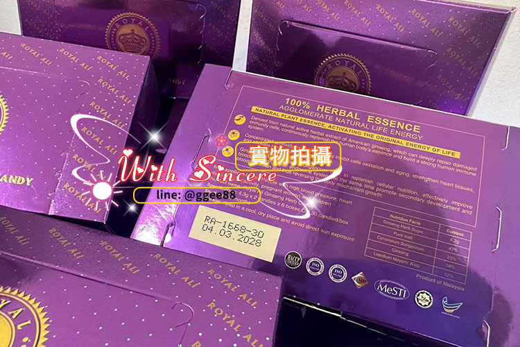 皇家紫糖 Royal Ali Candy 屬於 馬來西亞進口第六代汗馬糖高端限量款,原廠每批貨量有限,且需經授權檢驗後才會出口。由於產品定位高端、且含專利草本萃取配方,目前 台灣實體藥局並無現貨販售,建議消費者務必透過 官方授權通路 購買,才能確保產品真偽與使用安全。