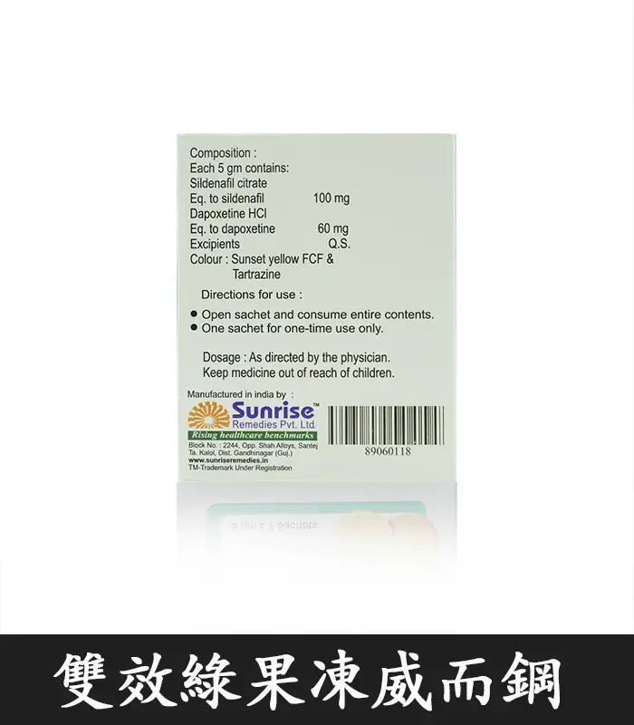 P-Force 果凍又被稱為「雙效液態威而鋼」或「雙效綠果凍」,是一款針對勃起功能障礙(ED)與早洩(PE)同步治療的高效雙效藥品。每包果凍含有兩種核心成分:西地那非(Sildenafil)100mg,可促進陰莖海綿體血液循環、強化勃起硬度;達泊西丁(Dapoxetine)60mg,則能延緩射精反射、提升性愛耐久度。